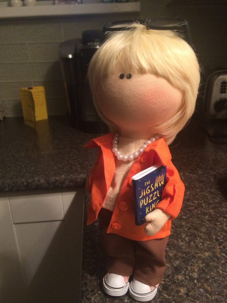A gift from one of my students –– the Gina doll holding her new book, The Jigsaw Puzzle King. Look familiar?